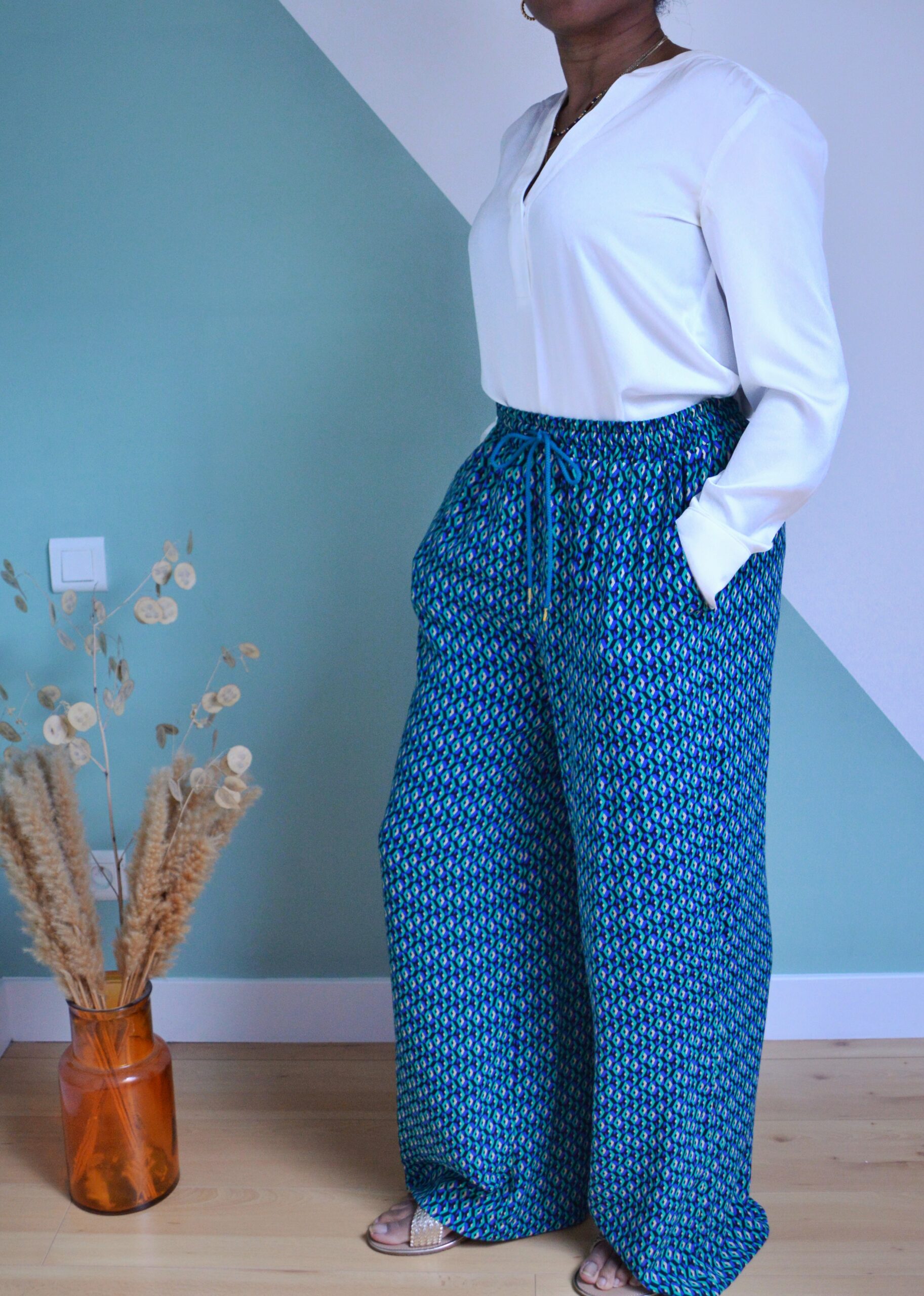 La réalisation de ce pantalon est accessible à un niveau débutant. Selon votre niveau d’aisance en couture, vous pouvez opter pour un tissu très souple (glissant) ou plus rigide si vous réalisez vos premiers projets couture.