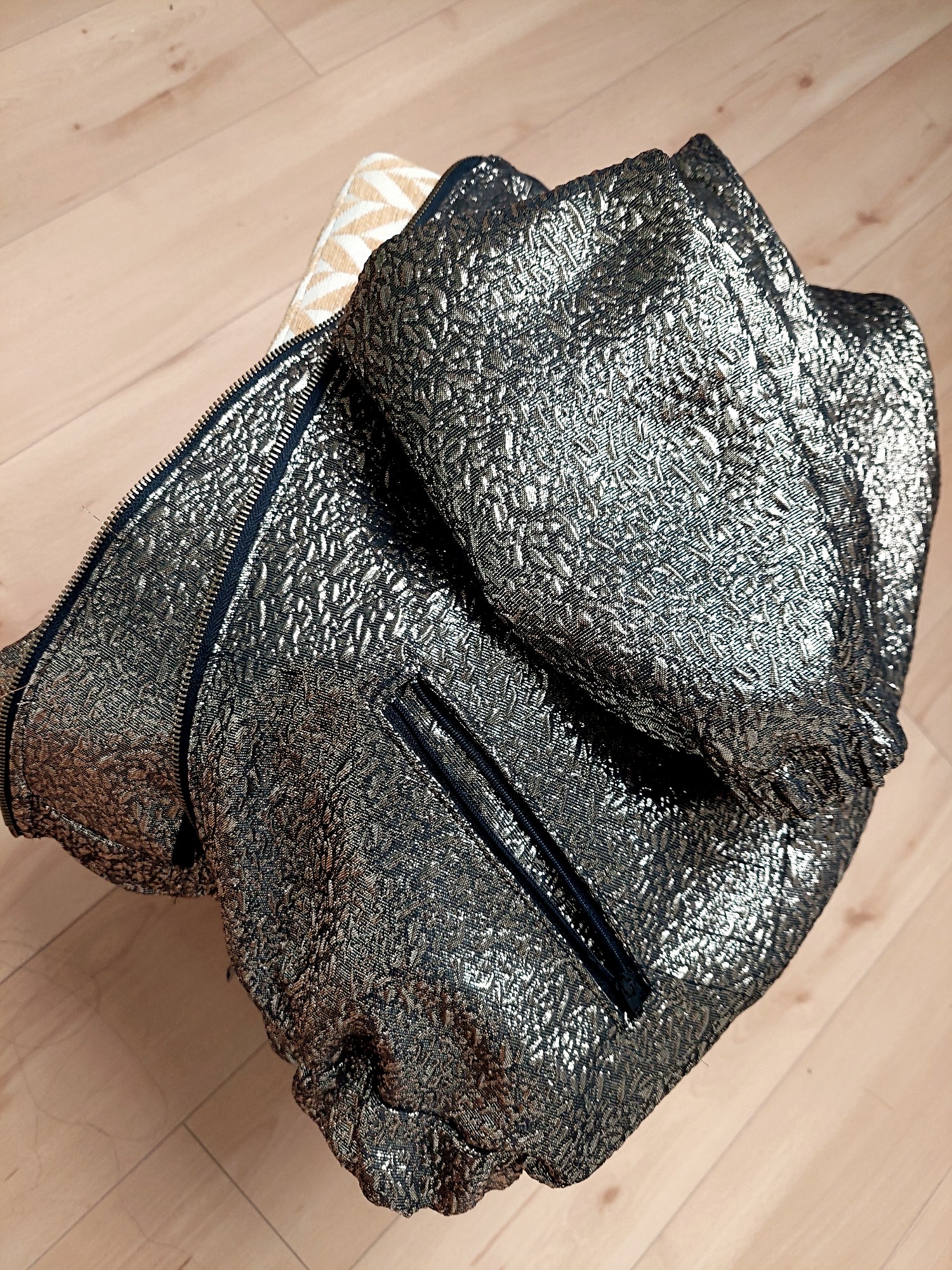 La grande fermeture par zip est très pratique. J’ai posé une fermeture éclair métallique qui s’accorde bien avec le doré du tissu. Et les poches sur les côtés se ferment elles aussi par un zip, ce qui est top pour ne rien perdre ! La méthode de pose n’est pas trop compliquée, il faut surtout s’appliquer. Je la garde dans un coin de ma tête car c’est pratique de pouvoir ajouter des poches zippées sur une veste.